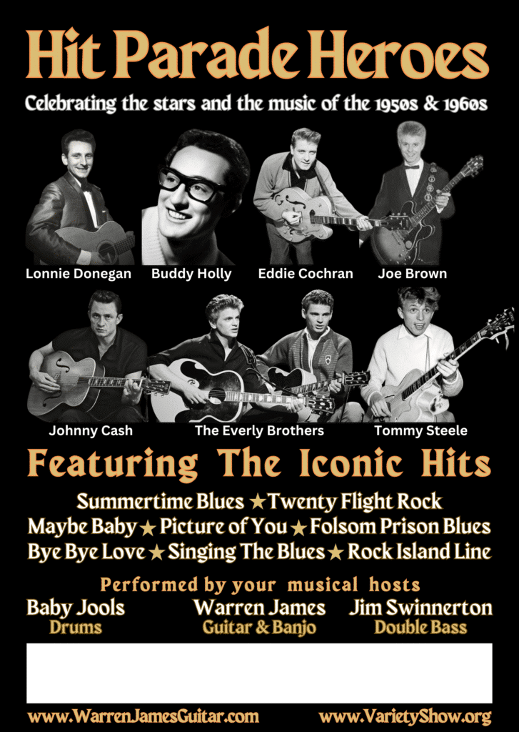 A new breed of music hero now dominated the British Hit Parade of the 1950s and 60s – with home grown talent such as Tommy Steele, Joe Brown, Lonnie Donegan, Adam Faith and Marty Wild along with many other American stars such as Johnny Cash, Eddie Cochran, Gene Vincent, The Everly Brothers and more.